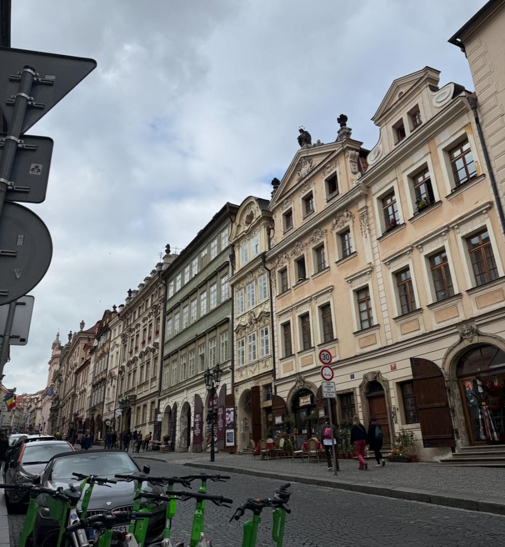 The next morning, we watched the eleven o’clock show at the city’s astronomical clock. Small statues of the twelve apostles moved in and out of the building, while other figures on the outside represented vanity, greed, and death. Later in the day, we took an audio walking tour of Prague Castle. The mix of architecture and history was stunning. I saw the window where the Thirty Years’ War started, walked down Golden Lane, a narrow street with tiny, colorful houses, and visited St. Vitus Cathedral. The church was breathtaking, with stained glass on every wall and dramatic gothic ceilings. It’s the most beautiful church I’ve ever seen.