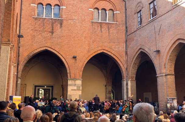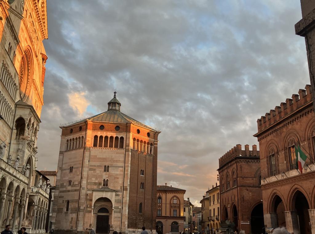 I arrived at the airport in Milan after nine long hours. My host family welcomed me with a big sign and a warm smile. We got home, and then my host mom took me for a walk around Cremona. I live in the center of the city, so everything is nearby. The streets are often filled with pedestrians and cyclists. I was surprised to see that even elderly people get around town by bike. After one day, I had already fallen in love with the city’s architecture. The buildings are so compact and colorful, each one with its own unique character. In the center there’s the Duomo, the main cathedral of the city. It’s gorgeous. Right next to it stands the Torrazzo, a tall bell tower you can climb on to get a view of the whole city.